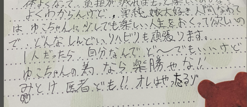 私たち夫婦は、毎年結婚記念日に「1年後のお互いに向けて」手紙を書く約束をしていました。最後の夫からの手紙は、寝たきりになる1年前に書いたものでした。