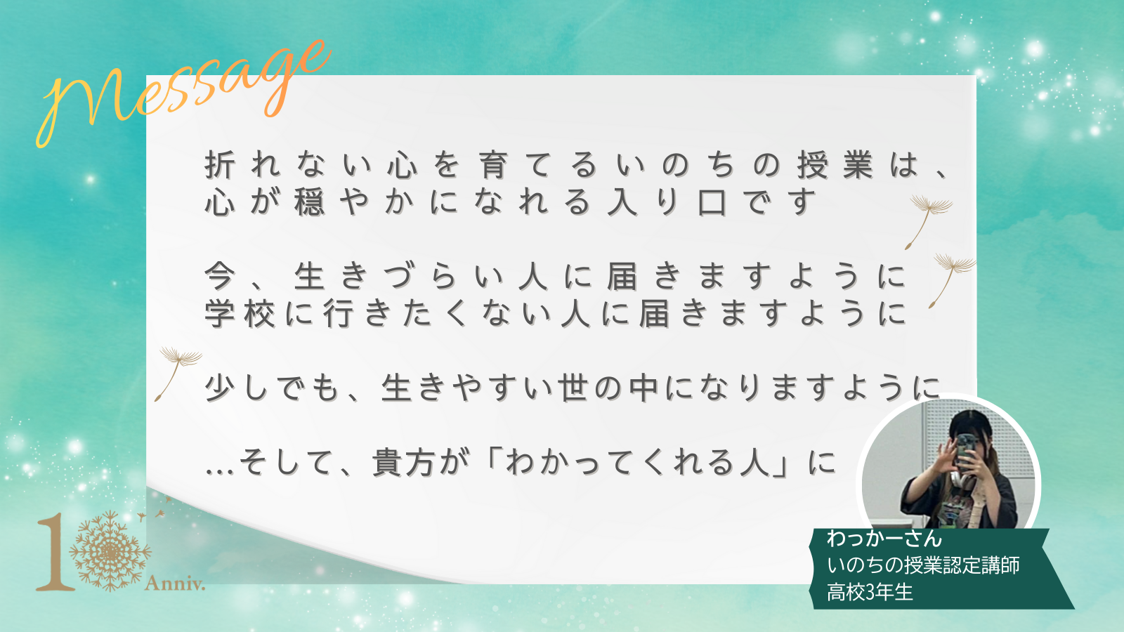 いのちの授業認定講師であり、高校3年生の「わっかーさん」は、