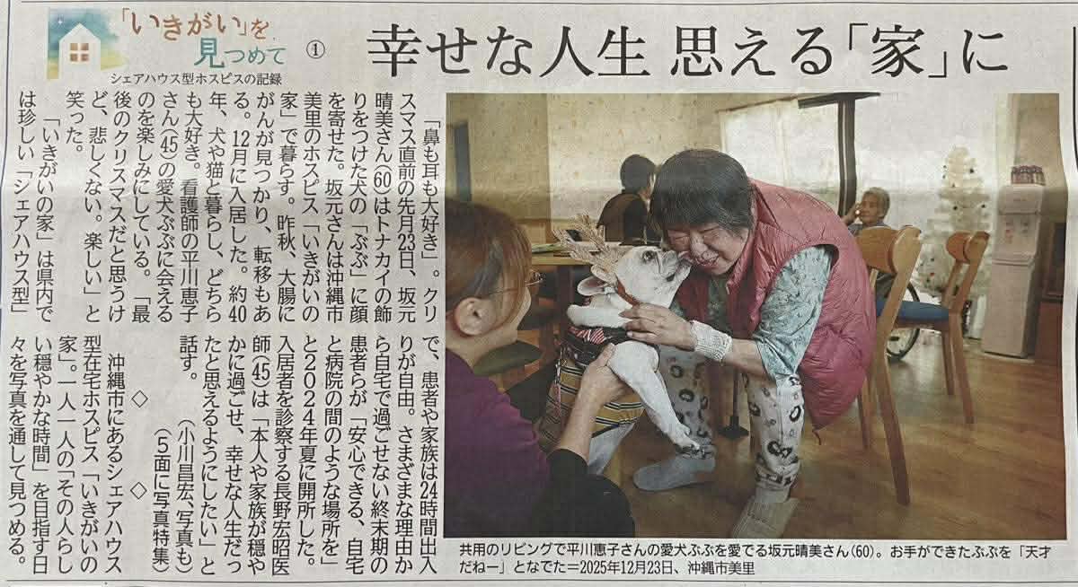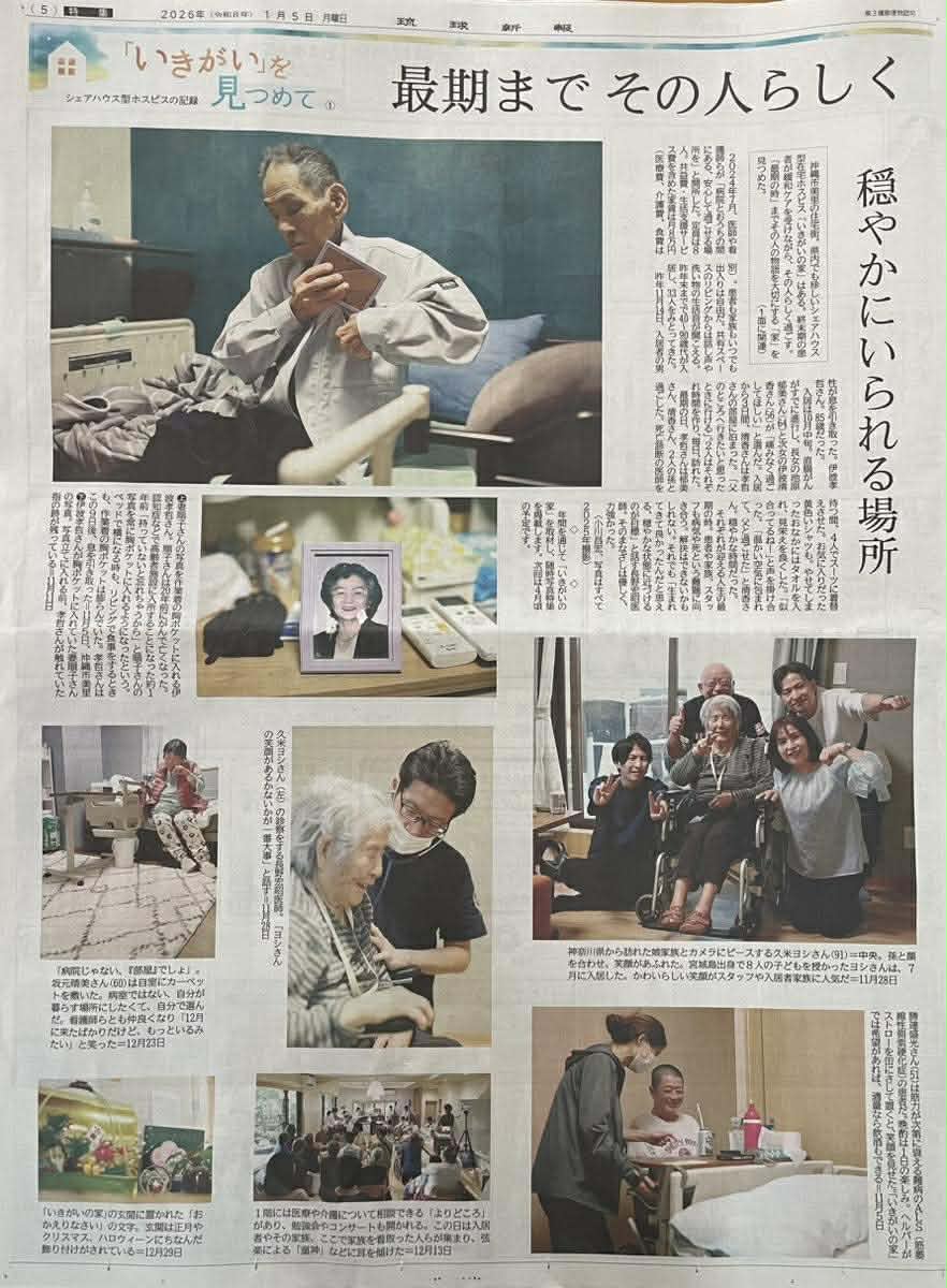 2026年1月5日、『琉球新報』の1面・5面に、沖縄市のシェアハウス型在宅ホスピス「いきがいの家」の様子が詳しく取り上げられました。