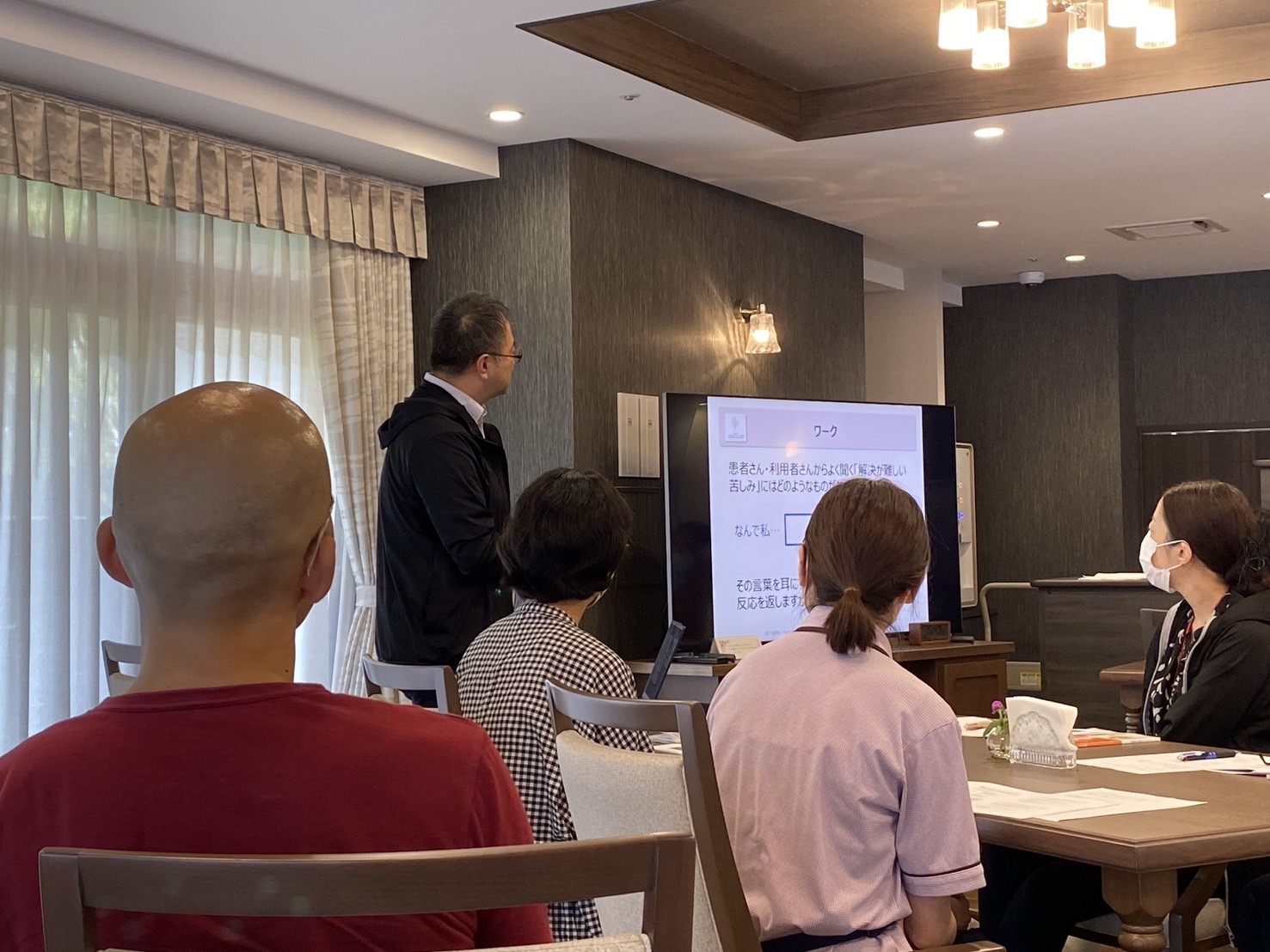参加者からのコメント | 利用者さん、患者さんの話をよく聞いて、聞くことで少しでも気持ちが軽くなるのなら、これほどうれしいことはないと思いました。 自分は無力であるが、そばにいる事はできる。何かできる事もあるはずとの思いを忘れない。これからも相手に寄り添いたいと思います。 一人では何もできないことを改めて感じました。これからも、利用者様の意見を傾聴し尊厳を守り、周りの方と支えていけたらと思いました。 数年前に末期で他界した父を思い出しました。遠方に住んでいたため看取りはできませんでしたが、亡くなる3日前に父の背中を撫でることはできました。どんなささいな父のセリフも今もよく覚えています。まさに、今回の研修の中身そのものだった気がします。 |