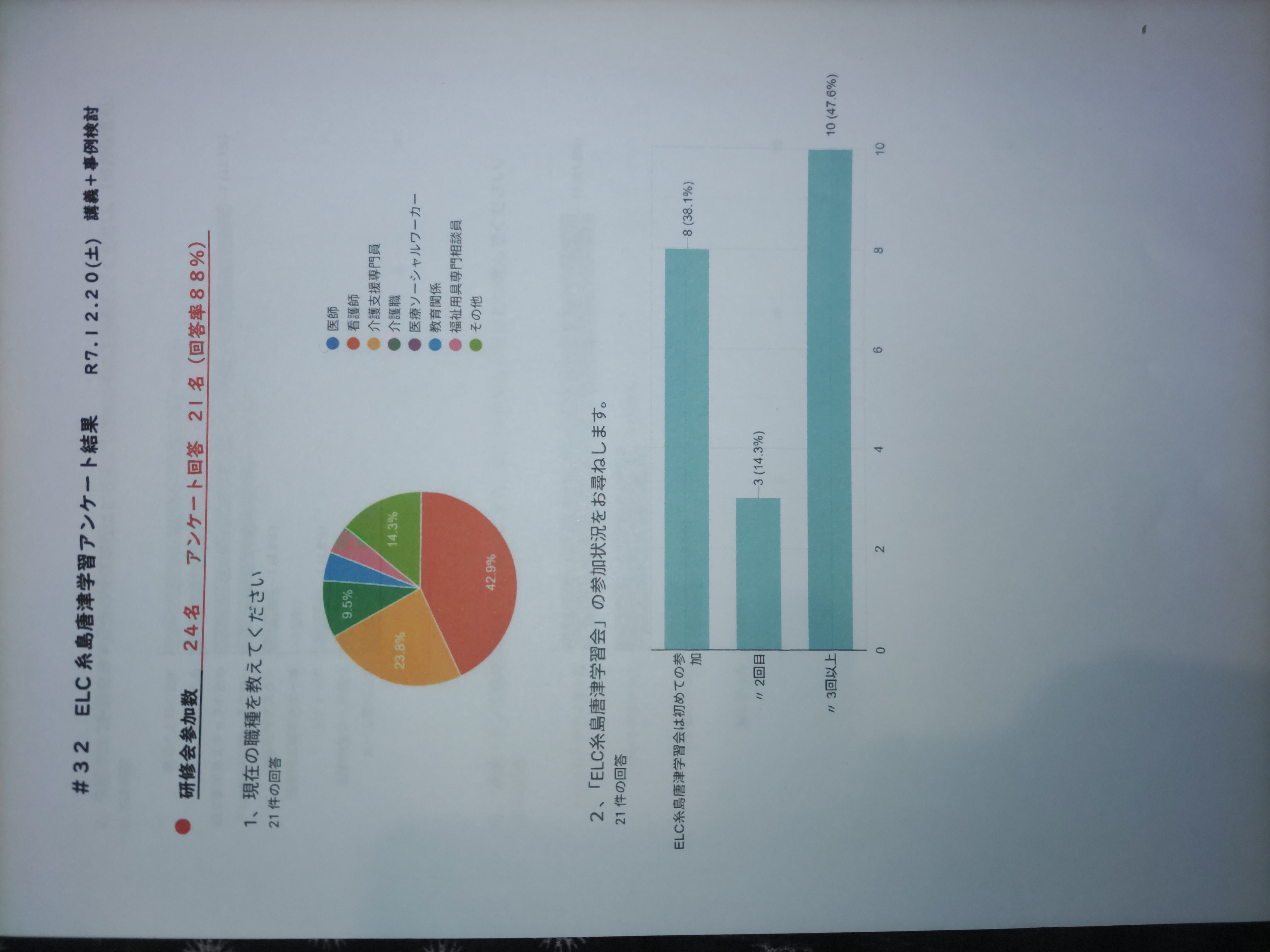| 参加者からのコメント | ・残される家族の思いにも働きかけることを忘れていました。また参加して固まった頭をほぐして、視野を広げたいと思いました。 ・支える、穏やかである事の大切さを、毎回実感させて頂いています。 ・難しかったですが、繰り返していきたいです。 ・前回のELCの時より深く理解できた。 ・事例が難しかったけど、自身にない視点の意見も聞けてとても参考になりました。 ・多角的に本人とらえ、支援の方法を検討できる知識を得られました。 ・とても貴重な内容で、公私ともに活かせると感じました。意図的に取り入れていきたいと思います。 |
