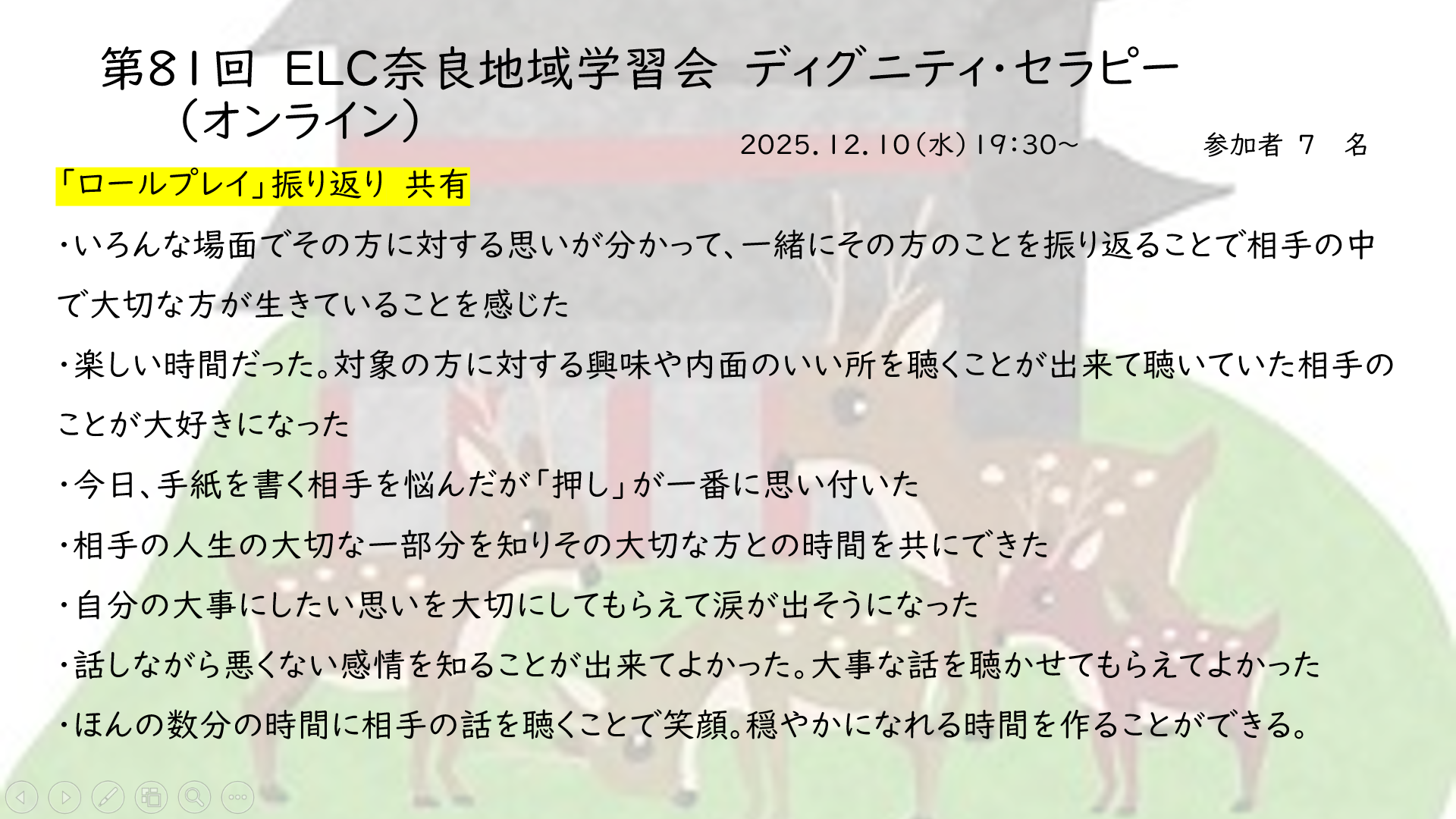 | 参加者からのコメント | アンケートの内容より抜粋 ・少ない人数だったので、十分に感想がきけた ・自分のことを語っていた時に、改めて今の自分の原点に気づき、大切な思いをより大切にしようと思えて良かった。 ・ディグニティ・セラピーは、実際に自身でやることで、このセラピーの良さがわかった。 ・みんなが笑顔で1年が締めくくれてよかったと思います。 ・皆さんの感想がとってもよかった。初めて参加の人がこれからも繋がっていってくれるといいなと思いました。 ・初めての参加で不安でしたが、あたたかく迎え入れてくださって本当に感謝しています。 2月1日の東京でのディグニティセラピーの勉強会も、何卒宜しくお願い致します。 ・楽しい勉強会でした。ディグニティセラピーは仕事でしていますが、今回のように本人の好きを手紙にすることはなく、新たな発見ができました。 ありがとうございました。1年の最後はディグニティセラピーがいいなと思います。 |