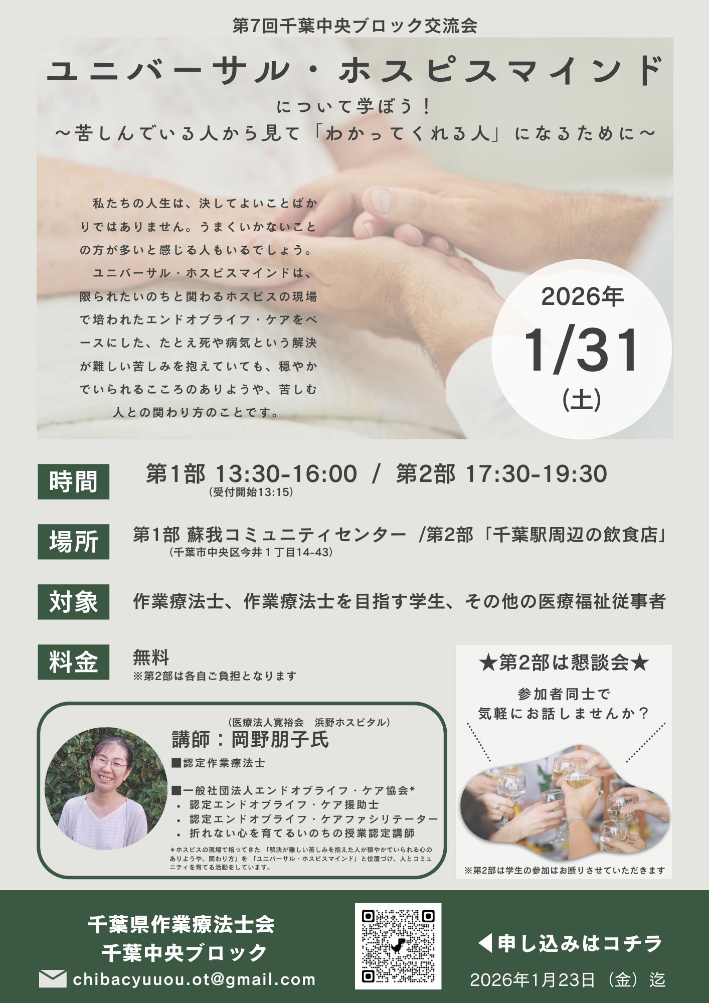 | 問合せ先 | ■ 申込方法 以下のURLよりお申し込みください。 https://forms.gle/ZUc23DPQQSebzZHJ9 ■申込締切 2026年1月23日(金) ■ お問い合わせ先 千葉県作業療法士会 千葉中央ブロック E-mail:chibacyuuou.ot@gmail.com |